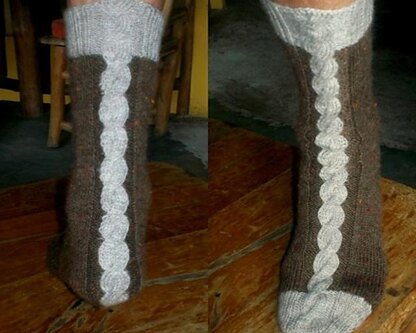 Big chunky cables in contrasting colors run down the front and back of these socks. The two color technique is an intarsia-in-the-round method which leaves no stranded yarns on the wrong side of the fabric. The heel construction is the traditional flap & gusset method with your choice of a plain heel or to bring the cable all the way down to the end to show off when you wear open backed shoes.