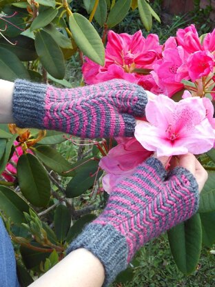 The Hutt Valley mitts uses a combination of stripes and simple cabled stitch which makes it look far more complicated than it is. Each row uses just one single colour to knit.