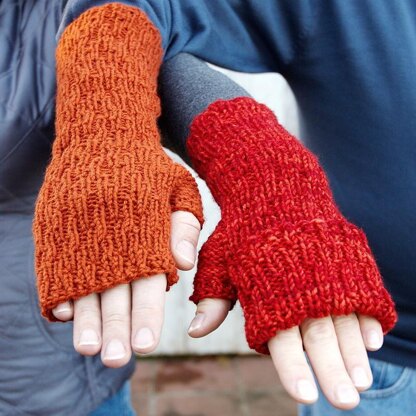 Made up of knits and purls with lifted bar increases for the thumb gusset, this is a pattern for advanced beginners. If you like long mitts you can make the gauntlet length version or choose to shorten the cuff down as far as you wish. The pattern is flexible so you can also choose to make the fold-over finger cuff shown on the shorter red mitts to keep your fingers extra warm.