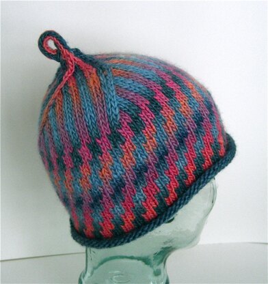 This is an easy and fun 2 color pattern. Choose 2 balls of different variegated colors (or two of the same....check out the gray version), cast on, and be prepared to be mesmerized by what happens. Watching the colors shift and change between your needles will keep you staying up way past midnight with the words “just one more row”. After the first hat you’ll want to try all the color choices. This hat is knit in the round starting at the bottom and working to the top.