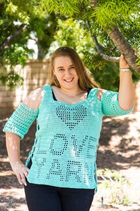 This unique filet crochet top spells out the words, "I Love Yarn" and features lace-up sides and peek-a-boo shoulders. Whether you're new to filet crochet OR making garments, this is an easy pattern either way.