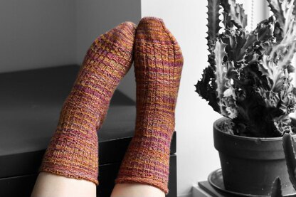 An ideal sock for variegated and/or hand painted yarns. The slip stitch pattern adds enough texture without competing with multicolored yarns. A simple pattern that is easily adjustable to many sizes.