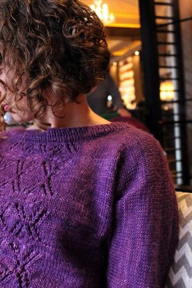 I played with the traditional Dolman, creating sleeves with a fitted wrist and less "batwing" than usual. Subtle shaping at the bust tailors them in just a bit, and since the sweater is knit bottom up in the round, you can easily adjust length or shaping. The lace is simple and delicate and has a bit of texture, plus it allows you a peek of tank underneath if you feel daring. The star of the sweater is the fabric, so I've made sure there is lots of stockinette. Soft, light, with gorgeous drape. It really just begs for big jewelry and a cocktail.