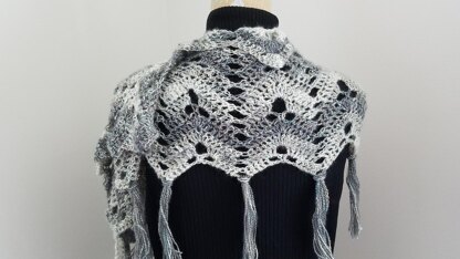 A Fun easy chevron pattern. Added fringe makes it fun. One ball pattern. I have used vintage Rhinestone earrings as a shawl pin.