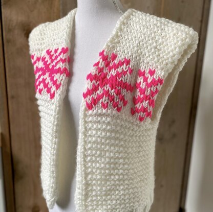 Knit needles: 12 mm Yarn: 400 Gram Bulky or yarn suitable for knitting- needles 12 mm (I used 3 strands of Aran yarn) Leftover fluorpink yarn Knitgauce: 9 x 11 (10x10 cm/4 x 4 inch) Size: oversized S Size: oversized M (use 4 strands and knit-needle 15 mm) Width x length 45 x 49 cm (18 x 19 inch) Length to armshole: 24 cm (9,5 inch) Stitches: Knit stitch Purl stitch Board stitch (knit 2, purl 2)