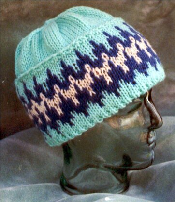 This is a good way to try an Icelandic style knit in pattern, before you tackle a sweater! You will get the feel for the pattern coloring in this simple hat. Nice style, fits both men and women. Easy graph to follow will have you finished with the color knit part in no time. Nice easy fit at top of head. Uses worsted weight yarns, and 16 inch circular US #8. Plus you will need a few double pointed needles US # 8 to decrease and finish top of hat. But dont worry, there are not too many rows of working with double points, and then you are done!