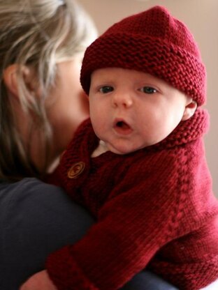 Sample uses Fyberspates Scrumptious Aran. Cardigan is shown on newborn in size 3 months; hat shown in Baby size. A substitute yarn is shown below.