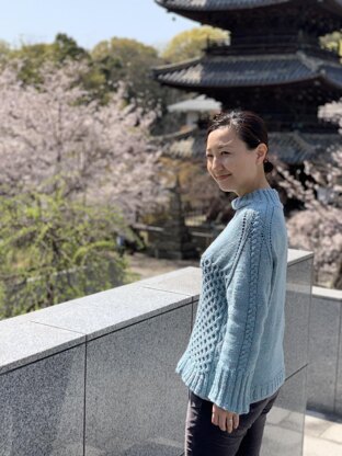 icy sweater is a loose fit sweater with lots of cables at the shoulder and the bottom body. I love this color mix of light blue and light grey which looks icy but it really is warm! You can make this sweater with fingering weight yarn held double like the sample or with worsted weight single yarn.