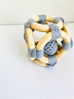 You can use any size of wooden rings to make this toy, along with cotton yarn. DK is preffered but you can also use Aran. This pattern calls for 6 wooden rings, and a rattle insert. The rattle is not required, as this toy can be used for holding, chewing, stacking or just play.