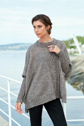 Iglu is a lightweight poncho to live in, hence the Inuit name Iglu, with a Celtic cable on center front and back. The poncho has sleeve parts in rib and a collar in garter stitch ending in a I-cord. It is beautifully knitted with shaped shoulders in the bouncy and lustrous Sølje Pelsull.