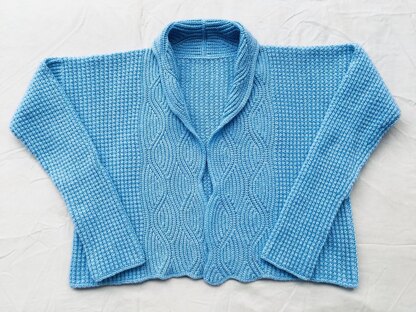 The Ije Awele Shawl Collar Cardigan is made by first crocheting three (3) rectangular panels: the back panel, two identical front panels. The three (3) panels are then joined to form one body panel at the sides and then the shoulders. The sleeves are crocheted attached from one side of the underarm to the other in flat rows, with short-rows being used to shape and finally joined. The shawl collar is worked in two halves and seamed at the back of the neck.