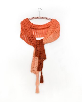Finished sizeIf you use the recommended yarn, you will get a wrap that is about 170 cm or 67″ in length (not including the tassels) and 40 cm or 16″ in width.
