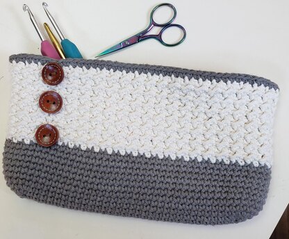 A quick project that would make a great last-minute gift. Whether it’s to carry your craft notions, for the kids’ backpack, make-up, or as a clutch… the possibilities are endless. It works up quickly using the crunch stitch, which combines half double crochet (HDC) and slip stitch (SL ST). Great little project for a beginner.