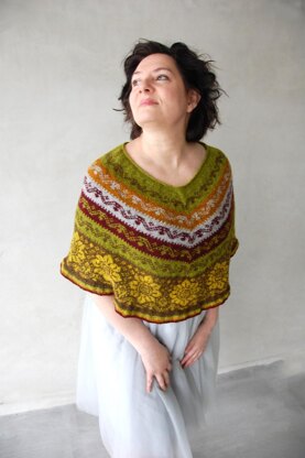This is a pattern for a poncho worked from the top down and using the Fair-Isle knitting technique.