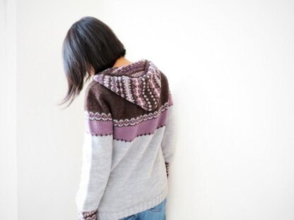 Fairisle hoodie cardgain worked in round with steeking at finishing stage. Fairisle design on hood,yoke and cuffs. Round yoke style with increases built in the yoke. Construction: Knit from top of hood to hem in round with sleeve stitches left on waste yarn at underarm to be completed after body. Sleeves worked in round.Cut steek at finishing stage, Pick up stitches along front edges for I-cord edge. Sweater is designed with zipper for closure. Links to steek and sewing zipper included in pattern.