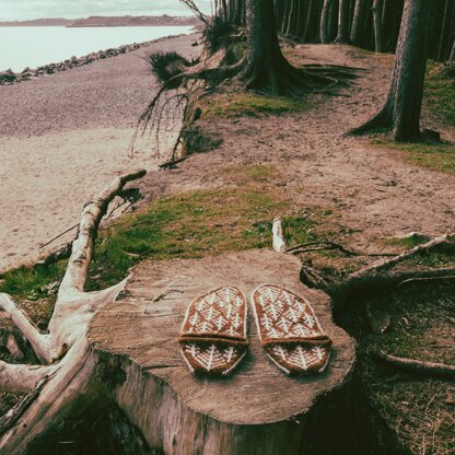 Inspired by the traditional American folk song ‘In the Pines’, these slippers are a fun and engaging little colourwork project. They are knit in the round from the heel to the toe in stranded colourwork with an afterthought opening for the foot. The slippers are anatomically correct with seperate charts for the left and right foot of each size.