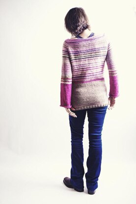 A 100% wool sweater, knitted on 4mm and 5mm needles in Aran weight wool. Wide-necked with varied stripes, a ribbed hem, and naturally curling sleeves and neckline.