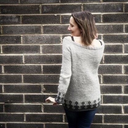 A boat-neck sweater with fairisle tree and shadow border motif on the hem and cuffs. Loose in body and tapered by the fairisle to sit snug on the hips.