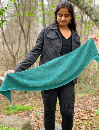 Inchara is a half-circle wrap constructed from the top-down. It has gently increasing garter sections regularly interrupted by subtly textured rows. The shawl is finished with a slip-stitch border.