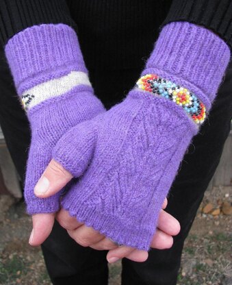The beads are pre-strung in a Native American inspired design and then knitted in for a bracelet like look. A knitted feather design and picot edge round out these very dressy and eye-catching fingerless mitts.