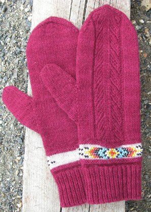 The beads are pre-strung in a Native American inspired design and then knitted in for a bracelet like look. A knitted feather design and a round mitt top finish off these very dressy and eye-catching mitts.