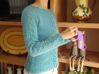 The pattern is easily modified/adjusted. Longer body, shorter sleeves(one of the testers made hers with lovely short sleeves), with or without waist shape, the lace on both front and back, a couple of lace repeat only at upper front, a couple of laces at forearms instead of all the way from the shoulder to the cuff,etc.