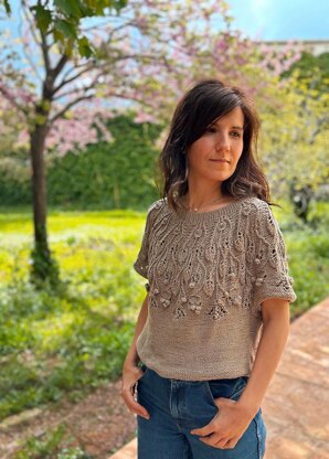 The tee has a seamless yoke construction and is worked from top to bottom. Once the yoke is knitted, the body and then the short sleeves are worked separately. At this point you can knit a few short rows to give more height to the back. The pattern consists of the following sections: