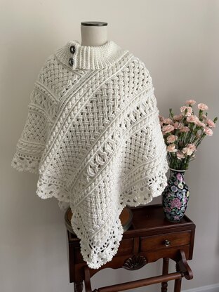 Wrap yourself in the luxury of crocheted cables! Named for one of the Aran Isles off the West Coast of Ireland, this poncho features several cabling stitches, a stunning lace trim, and a buttoned collar that can be worn 2 different ways. The complete video tutorial will lead you every step of the way, demystifying these seeming complicated stitches.