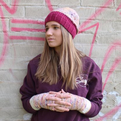 The beanie is knitted in rounds from the bottom edge up with shaping for the crown. It has an extra section of 1 x 1 rib after the garter rib edging. A pompom can be added on completion.