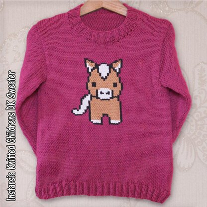 A picture of a Horse or Pony, a cute animal sweater inspired by the Chinese zodiac. Pattern includes chart for the image and written instructions for the sweater. I recommend using intarsia technique for the block colours and duplicate stitching the details.