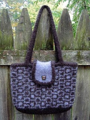 The felted bag in this knitting pattern is worked in a mosaic knit stitch with a single strand of worsted weight yarn throughout, except for handles.