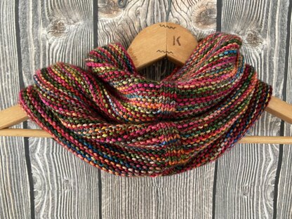 Intersection cowl is knit in the round in garter stitch with a small stockinette section to highlight how the hand dyed yarn plays in different stitches patterns. This simple cowl is perfect as a first knit-in-the-round project or a take along project for social knitting.