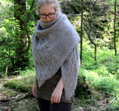 “Intertwined Roots” is an asymmetrical triangular shawl worked sideways. It features a detailed repetetive cabled edge and some stockinette with garter rows for the main body of the shawl. Some eyelet rows and a picot edge keep the knitting process encouraging until the end. Due to the loose gauge it is a light, soft and drapy shawl which is big and cozy at the same time.