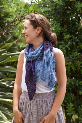 This lightweight summer shawl is insprired by the incredible colours and landscape of Tongariro National Park in New Zealand. Mountain peaks form a dramatic backdrop against hard blue skies, and flurries of snow drift about, settling on the stiff alpine grass and delicate flowers that stretch out into the horizon.