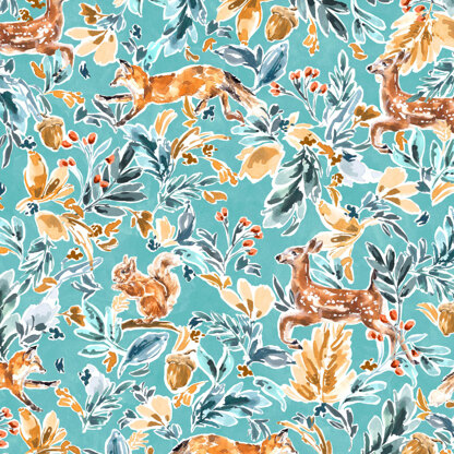 Eine abwechslungsreiche Mischung aus Mustern, hübschen Blumen und Waldmotiven in einem schönen, lockeren Aquarellstil, gemalt in einer frischen, lebendigen Palette von Aqua-, Gold- und Terrakotta-Tönen. Diese fröhlichen Stoffe beleben deine Nähprojekte für den Frühling und Sommer.