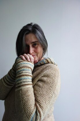 It is worked from the top down, seamlessly and in the round. Short rows are used to shape the body ending. This sweater have a positive ease at bust. It features the contiguous set-in-sleeves method developed by Susie Myers.