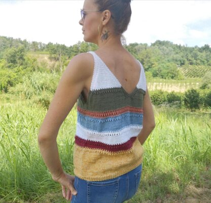 This pattern is worked flat in two pieces (front and back) from the bottom up and seamed. It features simple lace rows and colorful stripes. All shaping is worked on right-side rows. The instructions include 6 sizes (XS–XXL). You can customize the length or knit in a single color if preferred. Pattern includes detailed step-by-step photos and is available in Italian and English.