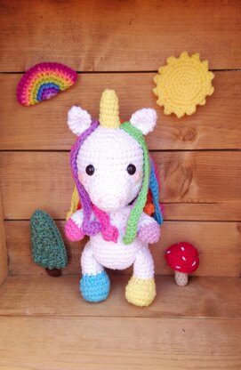 This cute little unicorn is crocheted all in one piece, the legs and arms are crocheted on then continue to the neck, then head. The only pieces to sew on are the muzzle and ears, horn, cheeks and curls.