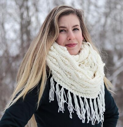 This cozy infinity scarf has been designed with warmth in mind! Wrapped double around the neck and knit with a double strand of merino wool yarn, it kept this Michigan girl warm throughout the winter. The scarf features an Irish bobble pattern. One size. Scarf is knit with a double strand of worsted weight yarn. Fringe is optional.