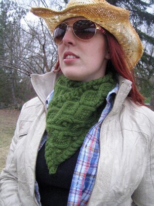 Irish Cowboy is a neck-warmer featuring a cable-and-bobble pattern on a background of reverse stockinette and moss stitch, bordered by twist cables. It is knit flat, then joined by seaming the cast-off end to the side adjacent to the cast-on end. This creates a shape that effectively keeps the neck warm while wearing a v-necked jacket. The cable trim is extended on one side and seamed to the cast-on edge to complete the finish.