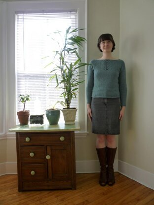 A feminine pullover worked in the round from the bottom up with a light gathers at the top of the sleeves and an easy to work lace panel. The only finishing is sewing up the underarm seams:) The sweater was knit with an unlabeled cone of yarn I had. I swatched with Quince and Co. Lark and it is a perfect choice.
