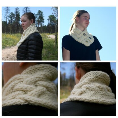 It's All About the Cabled Cowl is a warm and cozy cabled cowl that has cross over ends which button, creating a wonderful layer of warmth for open collared coats. The pencil roving is soft, fluffy and a dream to work with. However, the yardage is unknown. I used 1 skein of the Corriedale Pencil Roving in the model.
