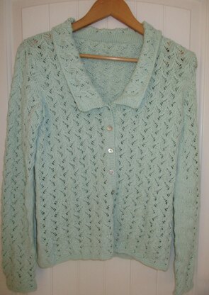 This is a pattern for Ivy Lace Cardigan, originally published in Knitting magazine. It has an all over lace pattern, and is finished with a twisted cord belt. Length 61-64 cm.