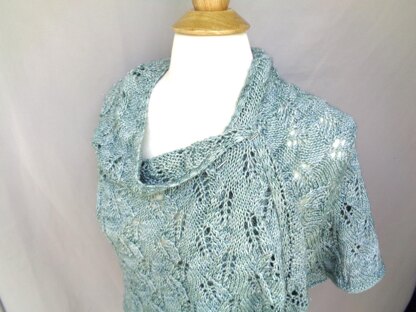 A joy to knit, watching the leaves unfold and delicately cascade down the body of this shawl, twinkling in a subtly sparkly yarn… stunning and enjoyable to knit.