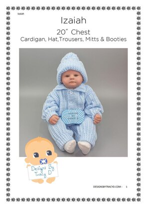 Izaiah is a Baby Knitting Pattern suitable for a baby boy or baby girl and has a collared cardigan, trousers, a bobble hat, mitts and booties and is a 20" chest finished size. It is made using DK yarn and 4mm needles, but can also be made in Aran yarn to make it bigger.