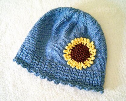 A simple alternative to standard ribbing is used for the band to make it unique. The rest is knit in simple stockinette to make sure you finish quickly! A big, bold sunflower is knit separately and then added later along with a crocheted picot edge.