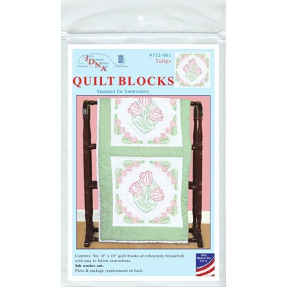 Create a beautiful quilt top using this great kit. It consists of individual squares to stitch and join together to form a quilt top. The stitching designs have been stamped using ink that washes away with any liquid and the fabric is a cotton/poly blend broadcloth. This package contains six 18x18 inch quilt squares, instructions for completion and care and complete list of DMC floss requirements. Fabric, backing, needle, thread and floss all sold separately. Design: Tulips. Made in USA.