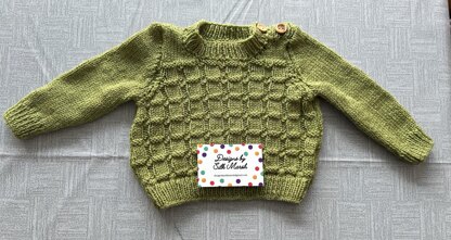 Our Jack design is a jumper with a textured pattern to the front and back, and stocking stitch to the sleeves. It has button holes and the shoulders for ease of dressing. This pattern is suitable for a beginning with some experience of knit and purl stitches. It has been knitted using Baby DK yarn. It uses 3.25mm and 4mm knitting needles. It will fit age ranges 6 months to 3 years, which is 18” to 22” chest sizes.