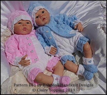 Knitting pattern for a pair of shorts with a bib to the front, jacket, hat and bootees using s simple knit and purl pattern that gives a lovely textured appearance. Knits in three sizes depending on size of needles and yarn used.