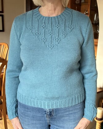“My design was influenced by the beautiful Rococo style of the Wallace Collection in London,” says Emma Vining. “It has a twisted stitch design around the neckline inspired by a semi-precious stone necklace, while the sleeves feature ‘bracelets’ at the wrist. The main body of the sweater is knitted in stocking stitch, which gradually changes to reverse stocking stitch with the twisted stitch necklace. An even tension is maintained by increasing for each cluster as it begins.”